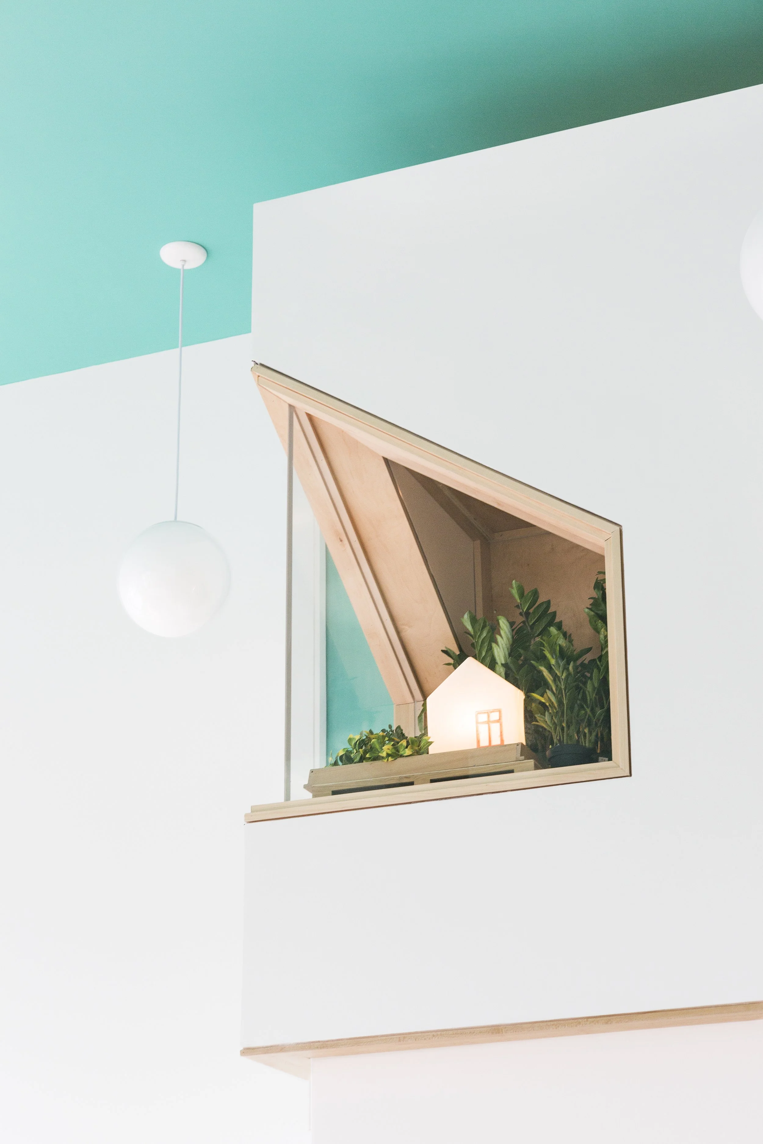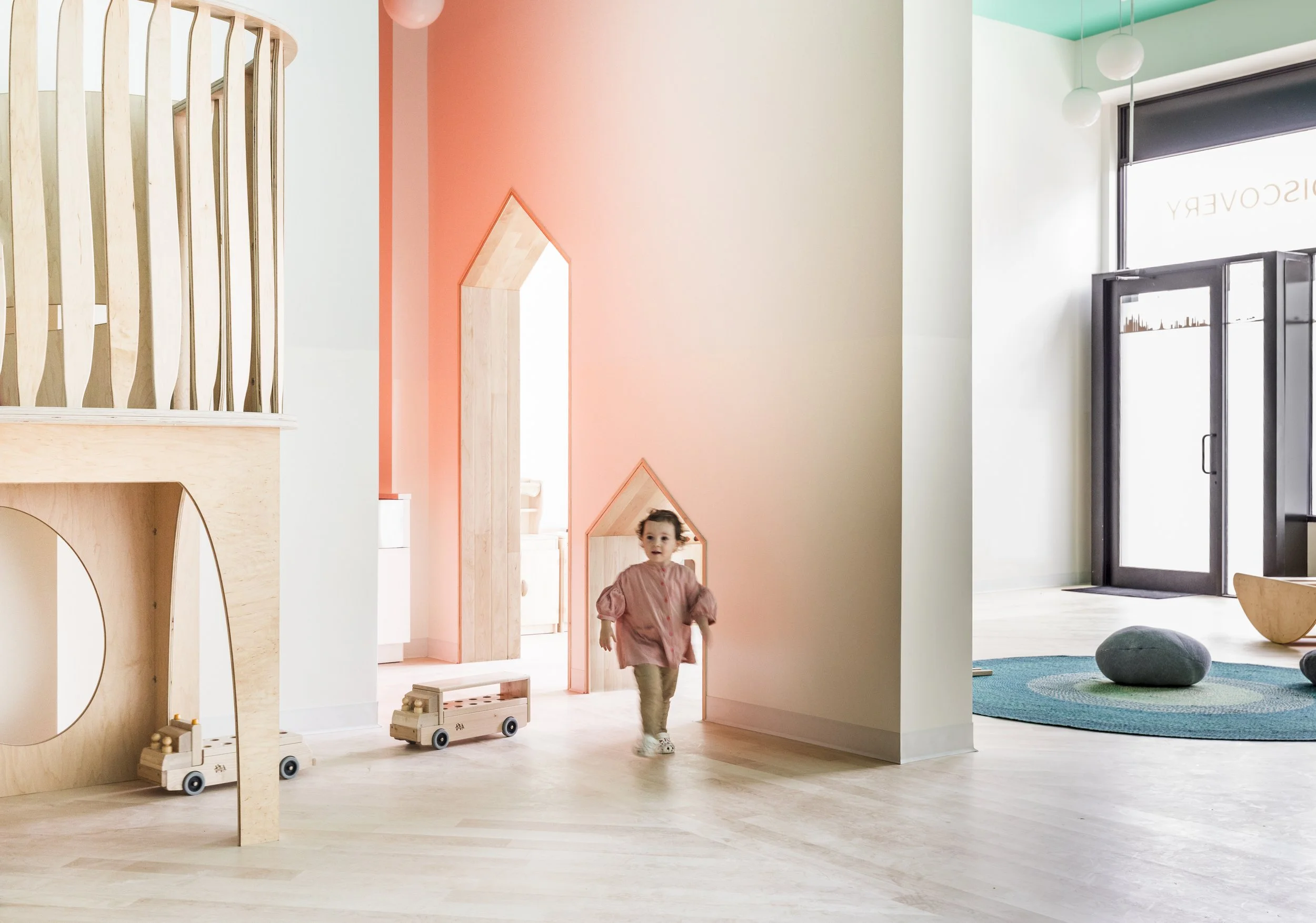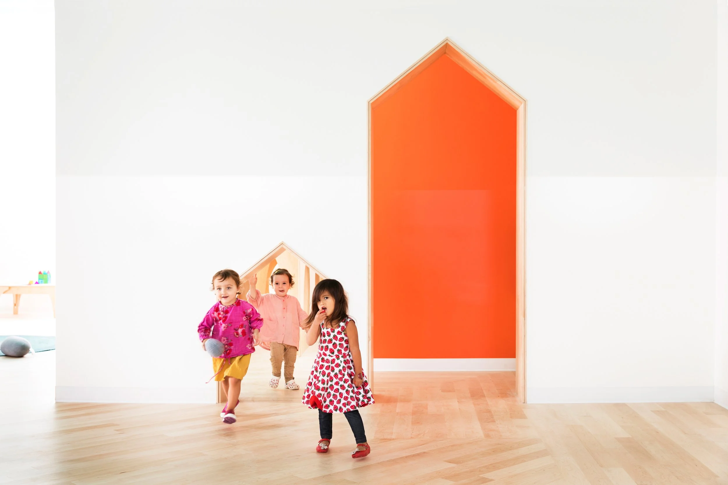 The concept of the school as a home away from home, as described by its director, inspired the use of an abstracted silhouette as a motif throughout the space. Niches, openings and vitrines offered children visual complexity, as well as a variety of spatial experiences.